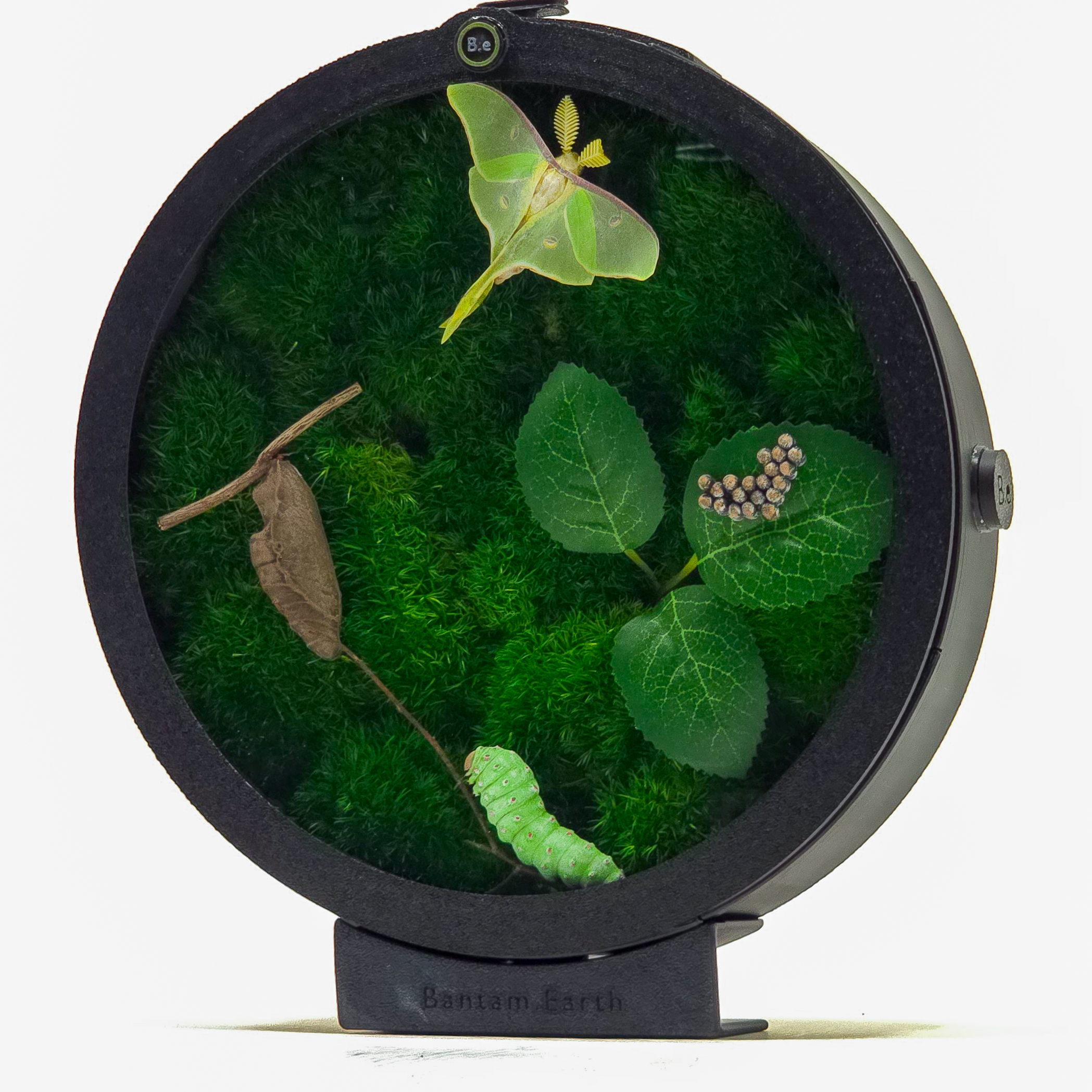 Nature immortalized. The Legend of Luna is a premium Luna Moth Moss Wall Decor piece that tells the story of one of nature’s most mystical creatures. Built into a sleek, round frame with a protective glass front, this display features a vibrant, preserved moss wall background. Set against the greenery are four intricately 3D-printed and hand-painted miniatures depicting the Luna moth’s entire life cycle… from tiny eggs to the majestic adult. Available in black or white housing, it’s a stunning, zero-maintenance way to bring a touch of the forest into your sanctuary.